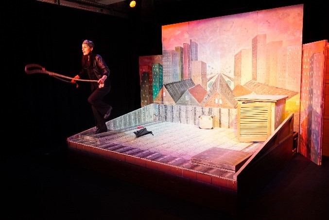 "Mobfer -f " bringt 2 gestrandete Außenseiter auf die Bühne, genau genommen auf ein Dach, denn hier spielt das Stück. Ein Dach über der Stadt als Fluchtort für 2 jugendliche Schüler*innen, die ihren Platz, im direkten und im übertragenden Sinne, in der Klasse nicht finden können: Klaus und Lilly. Unterschiedlicher können zwei "Opfer"-Rollen nicht sein. Anfangs ist auch nicht abzusehen ob nicht Lilly doch eher zu den "Zockern", zu den "Schlägern", zu denjenigen gehört, die "dissen". Klaus dagegen, der ewig höfliche, der freundliche, nimmt fast noch seine Mobber, die "Haifisch-Gang" in Schutz. Lilly flüchtet, hält alles von sich fern, schwänzt die Schule, entschuldigt sich selbst.